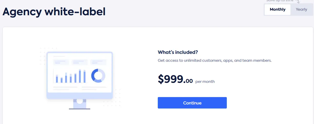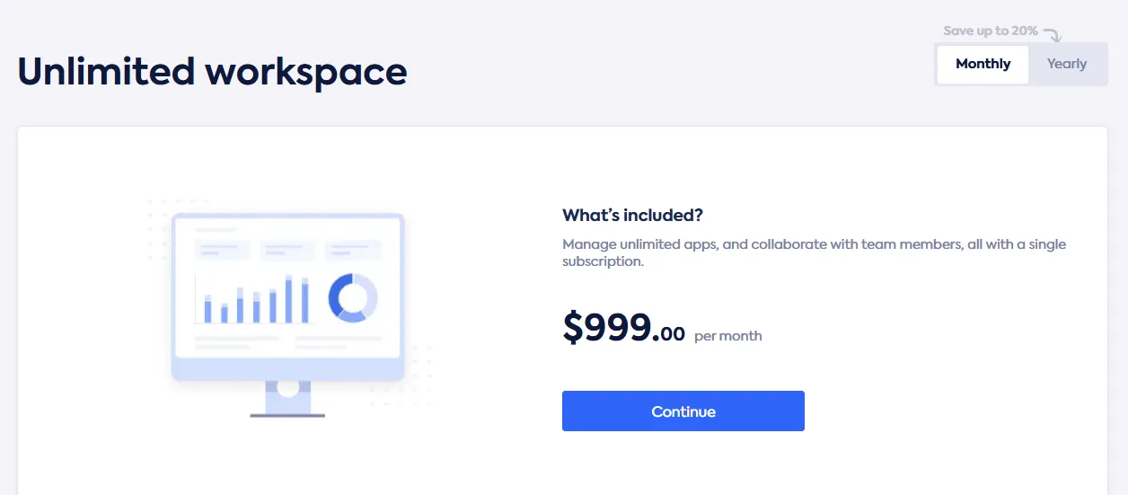 • High-volume businesses or agencies can opt for the Agency White-Label or Unlimited Workspace plans at $999/month, both supporting unlimited apps and team collaboration.