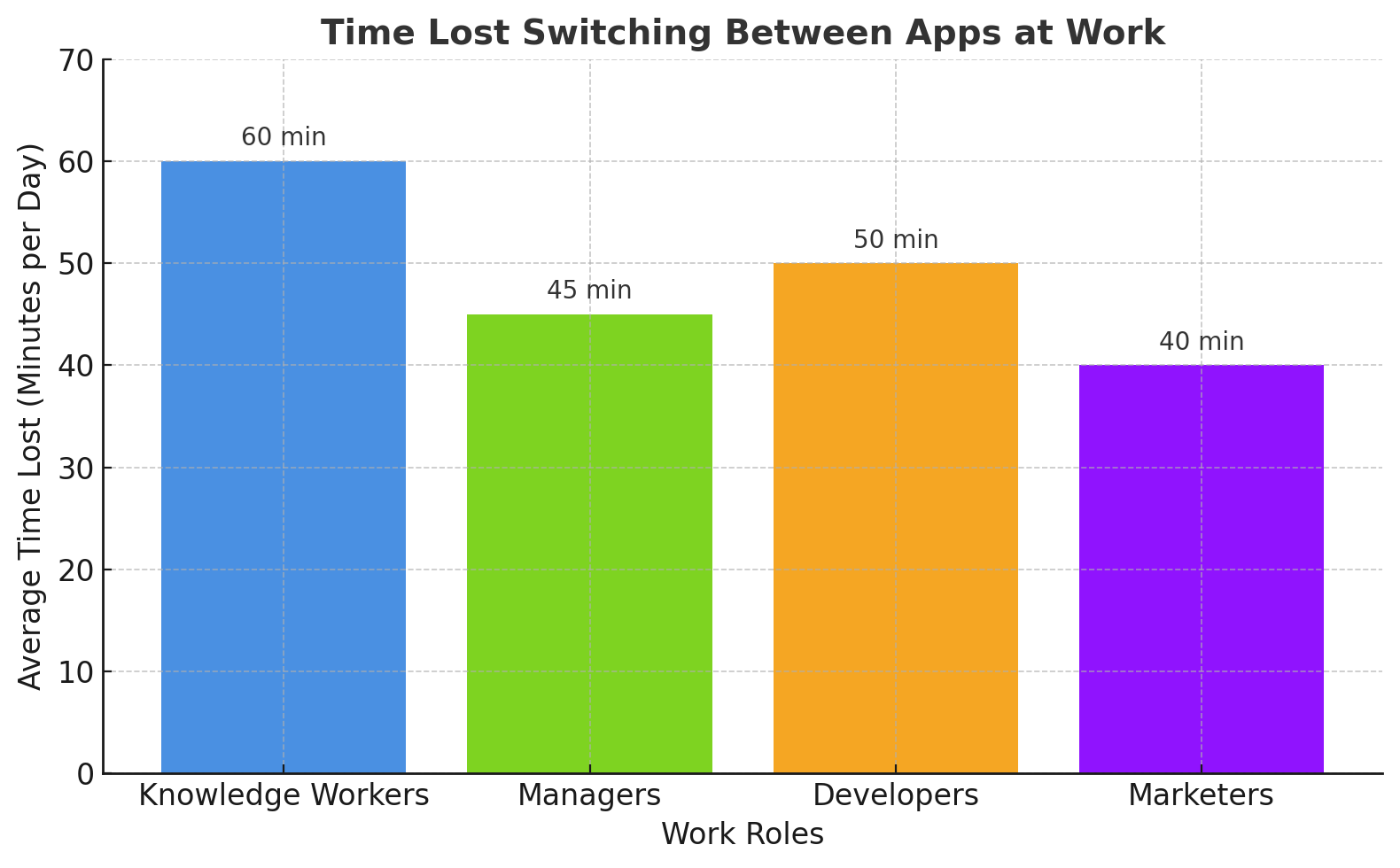 Many people today spend a lot of time switching between different apps while working and employees can lose up to 60 minutes a day just moving between tools. That adds up to more than 5 hours a week of lost time because the workflow isn’t smooth.