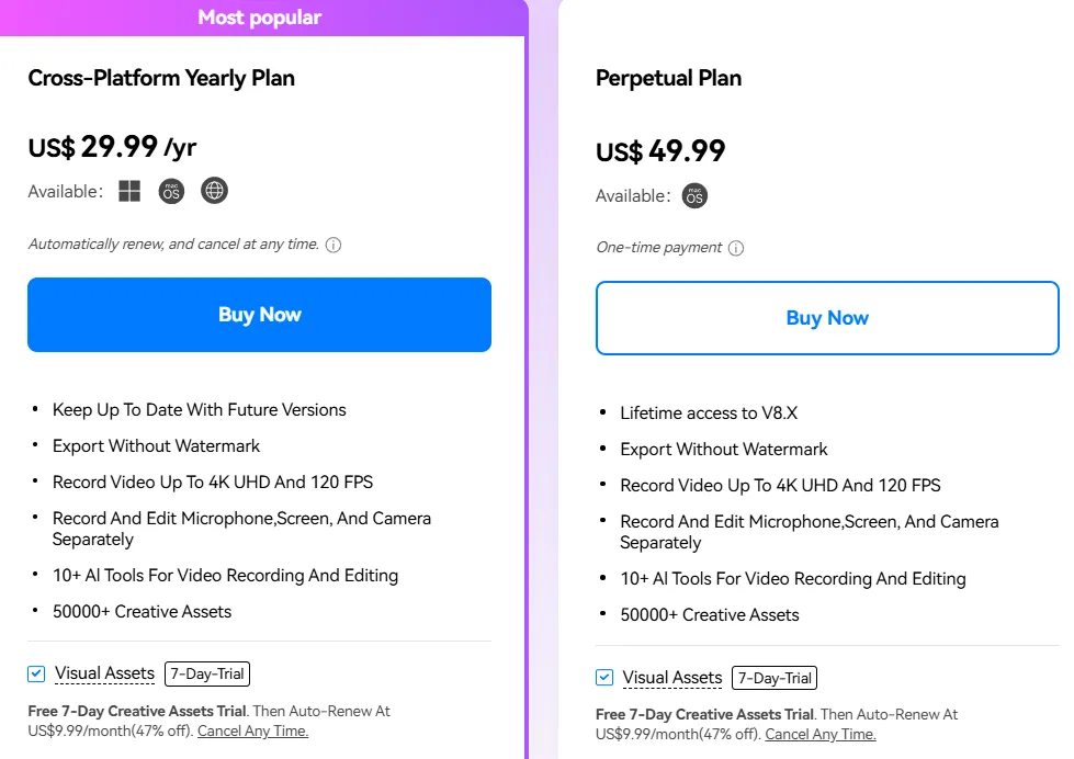 | Perpetual Plan | US$ 49.99 | One-time payment | Lifetime access to V8.X, export without watermark, 4K UHD & 120 FPS recording, AI tools, 50,000+ creative assets |