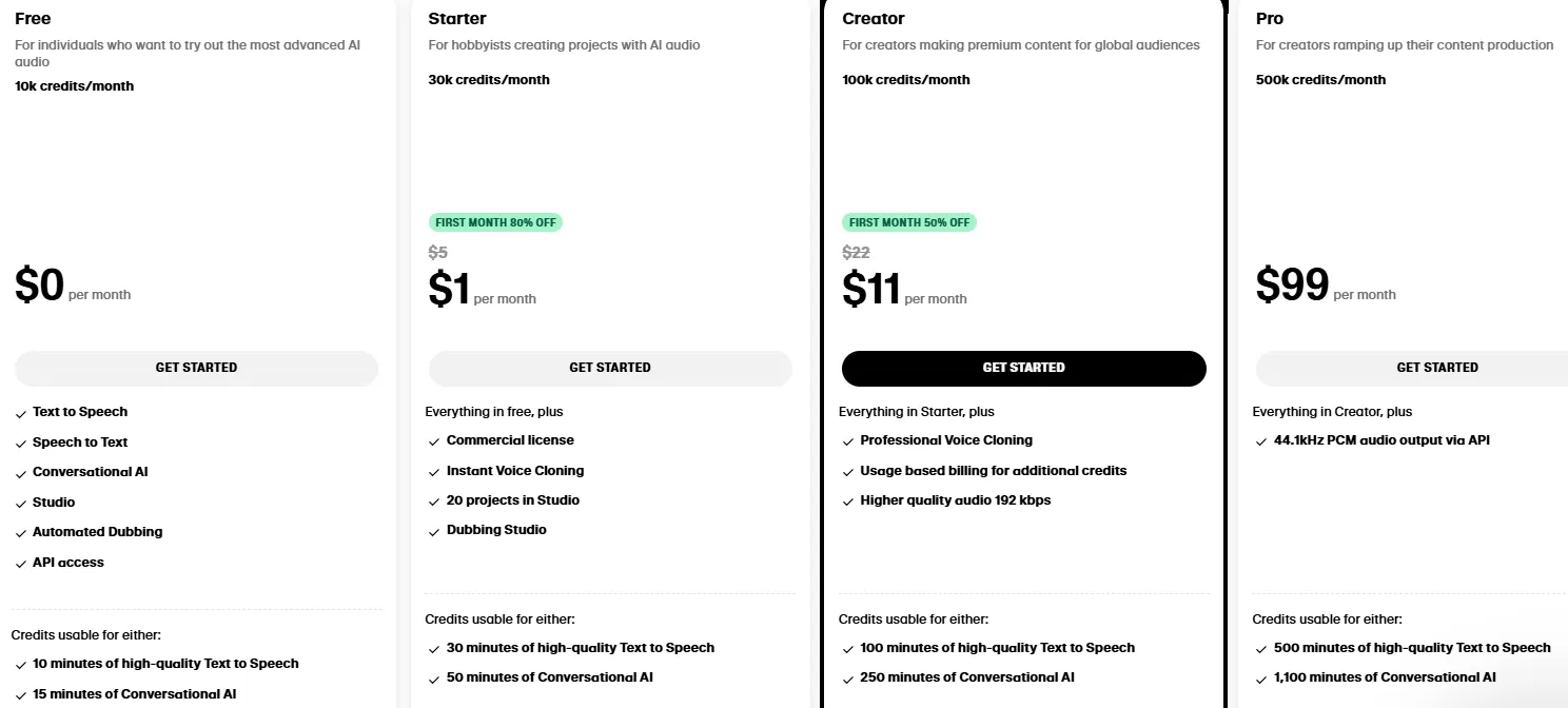 | Starter | 30K | $1 | Everything in Free, plus Commercial license, Instant Voice Cloning, 20 projects in Studio, Dubbing Studio |