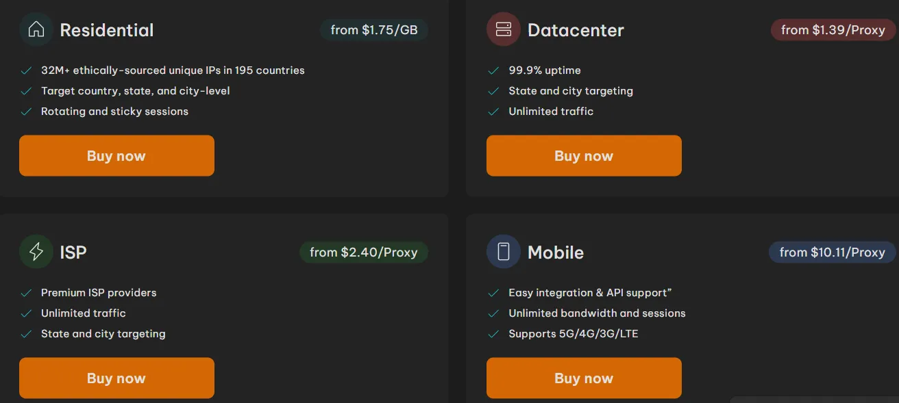 - Premium Mobile Proxies – If you need mobile IPs, the $117/month plan provides high-speed, real-device proxies.