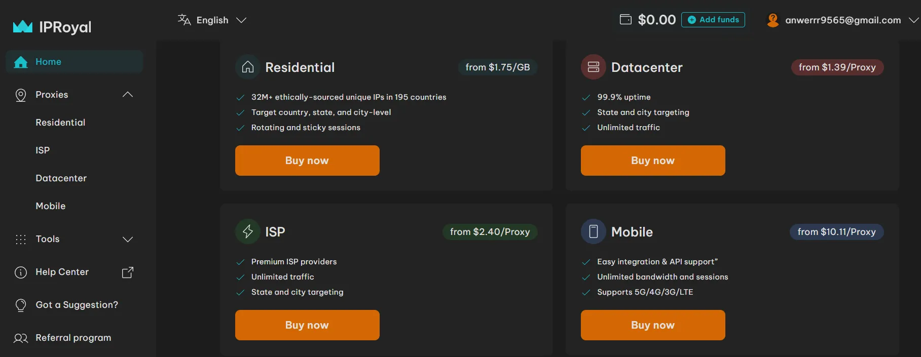 IPRoyal offers pay-as-you-go pricing as well as bulk discounts, with rates varying by proxy type. Residential and mobile proxies are billed by traffic usage (GB), while datacenter proxies are typically charged per IP monthly, making the service flexible and scalable for different needs.