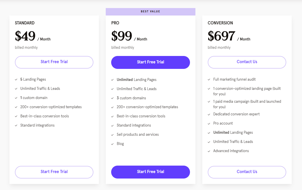Leadpages offers three main pricing plans, designed to fit different business sizes and marketing needs. You can pay monthly or save money by choosing annual billing. Here’s a simple breakdown of what each plan includes: