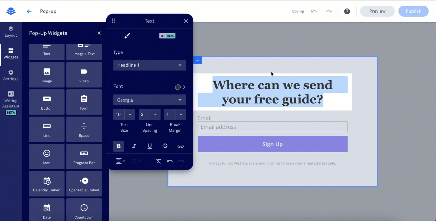 Create as many pop-ups as you want for capturing emails, promoting offers, or sharing announcements. You can trigger them based on time, clicks, or when someone’s about to leave the page.