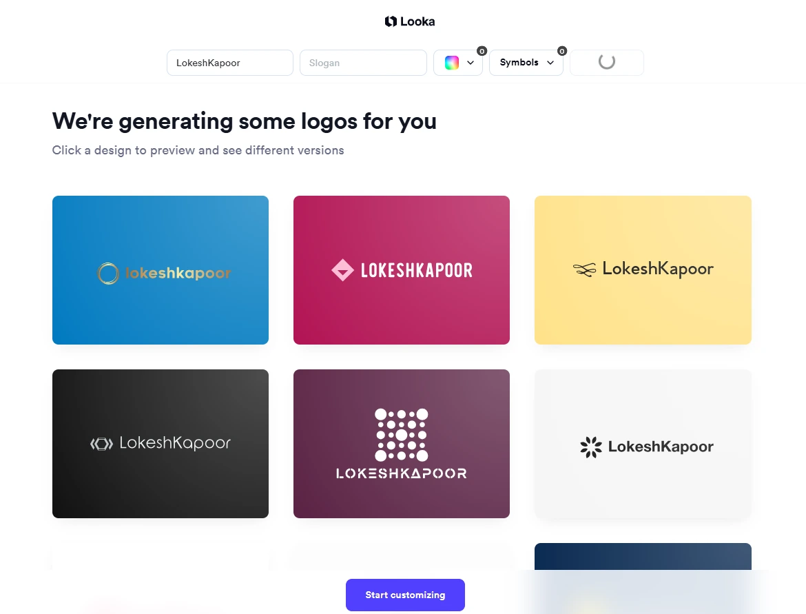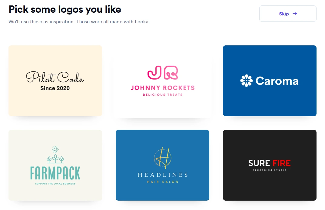 Looka will show you a few logos. Click on the ones you like. This helps the AI learn your taste and generate better suggestions.