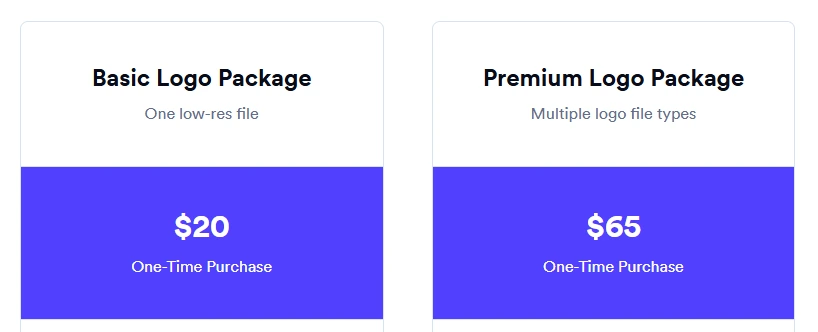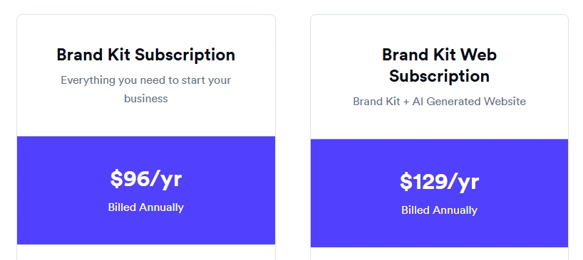 Looka offers four pricing options to suit different branding needs. You can choose between one-time logo purchases or annual subscriptions that include a full brand kit and website builder.
