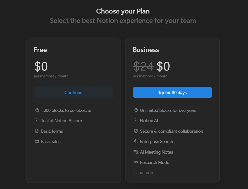 Yep! Notion has a free plan, perfect if you’re flying solo or working with a small team. You get access to all the basics, and honestly, for individual use, it’s pretty generous. But if you need fancier features—like advanced permissions, teamspaces, or AI-powered assistance—you’ll want to check out the paid plans.