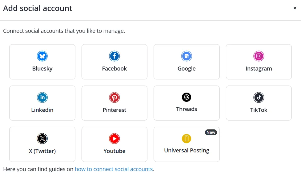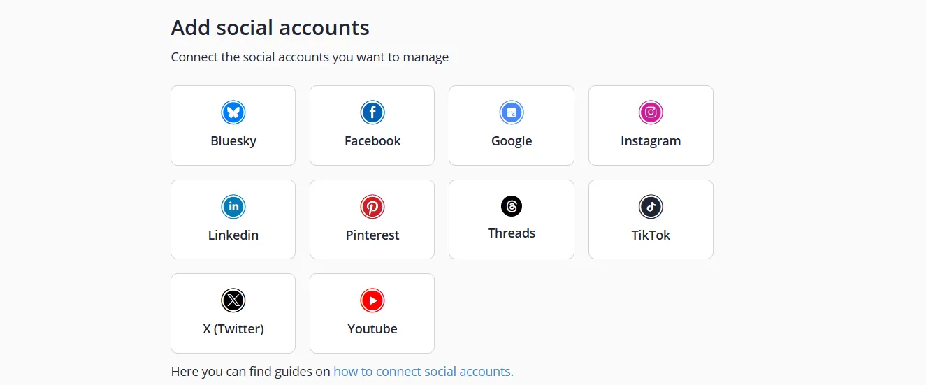 | Supported Platforms | Facebook, Instagram, Twitter (X), LinkedIn, Pinterest, TikTok, YouTube, Google Business Profile, Threads, Bluesky |