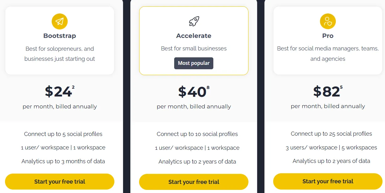 | Bootstrap | Solopreneurs & small businesses | $24.24 | 5 social profiles, 1 workspace, analytics (3 months of data) |