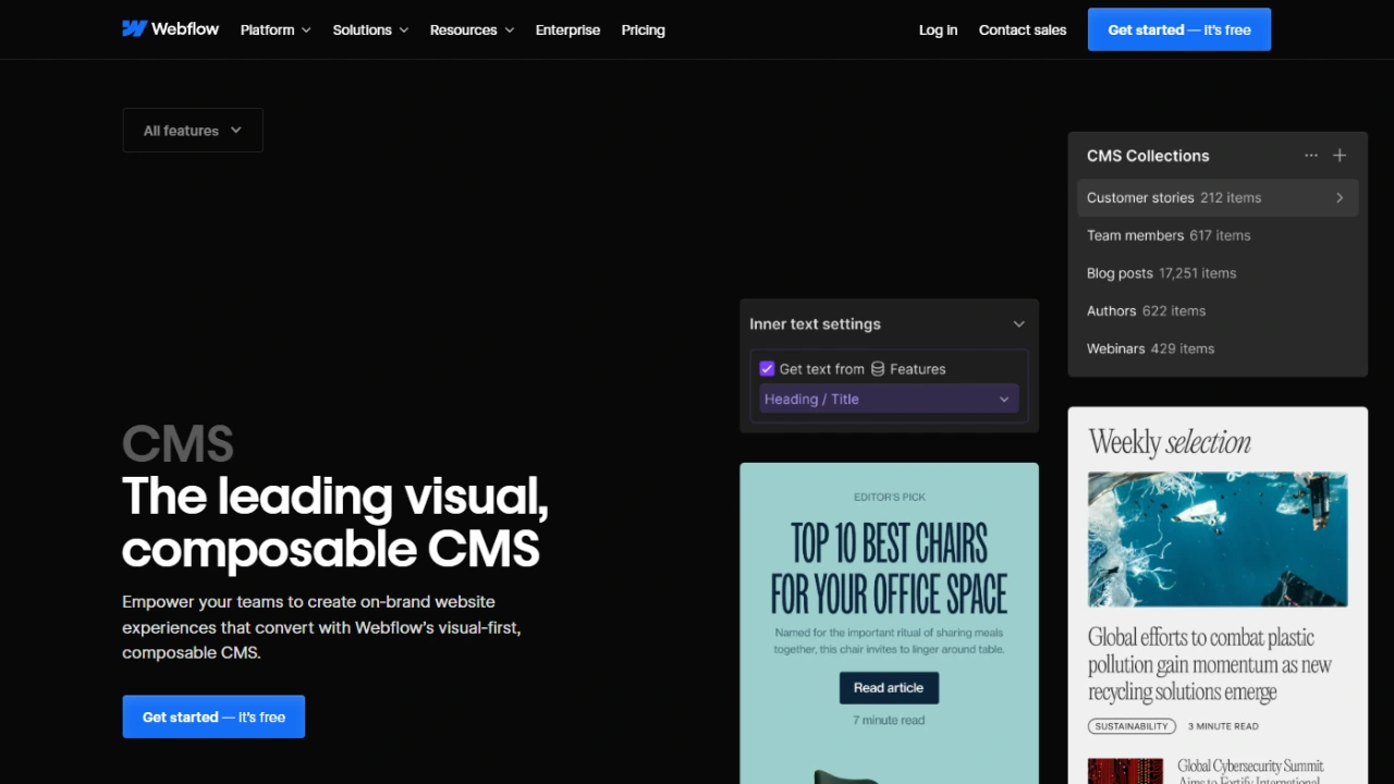 Webflow’s CMS lets bloggers and creators design beautiful, customizable blog layouts, manage posts easily, and optimize content for SEO — all without relying on plugins or extra tools.