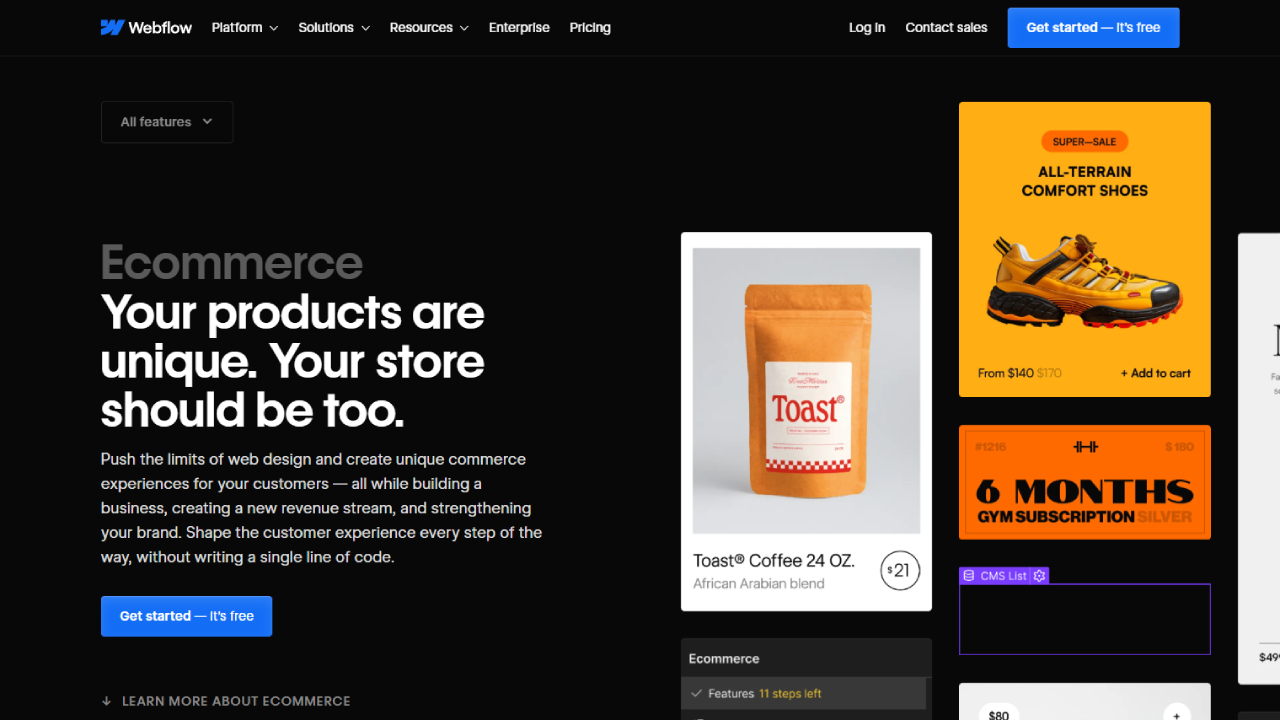 Great for small online shops, Webflow offers customizable product pages, secure checkout, and smooth inventory management for businesses prioritizing unique design and a lightweight, fast store setup.