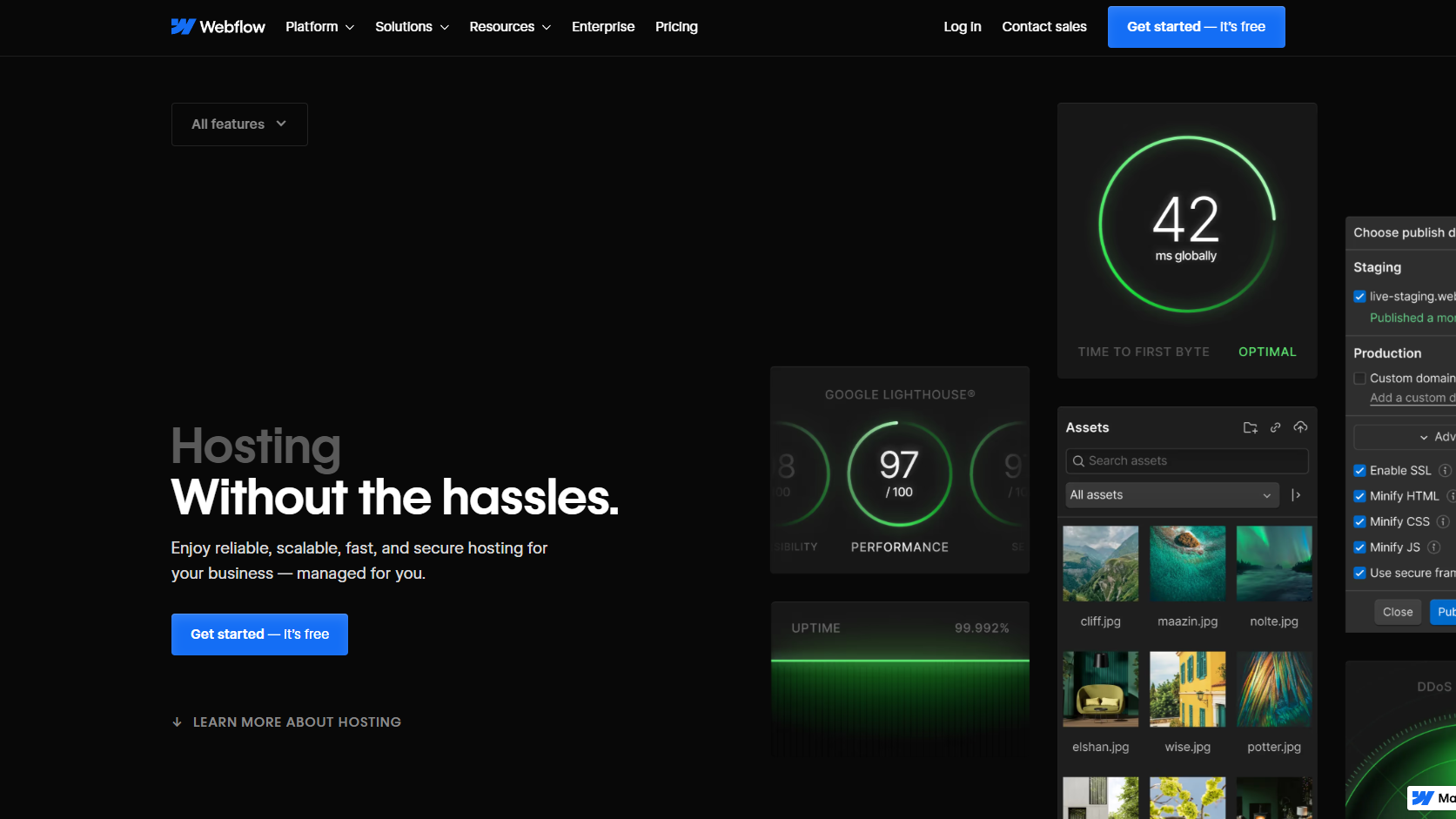 Webflow offers reliable hosting with AWS and a global CDN. Benefit from fast load times, free SSL certificates, daily backups, and automatic scaling to handle traffic spikes securely.