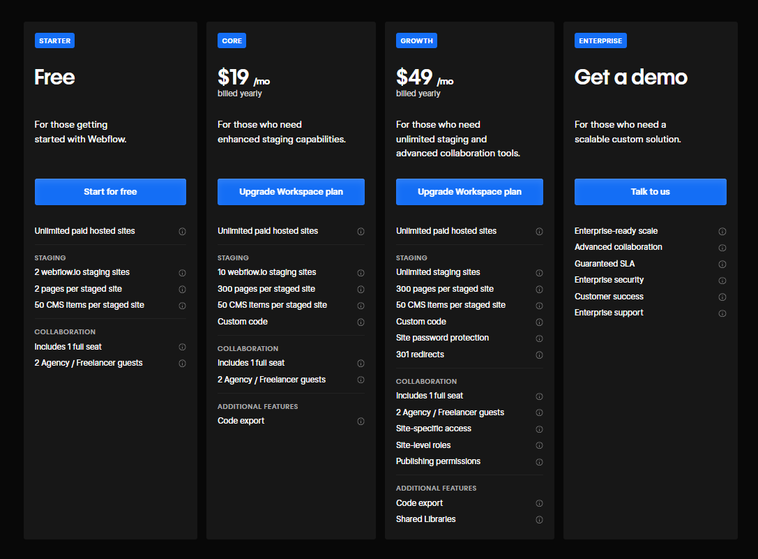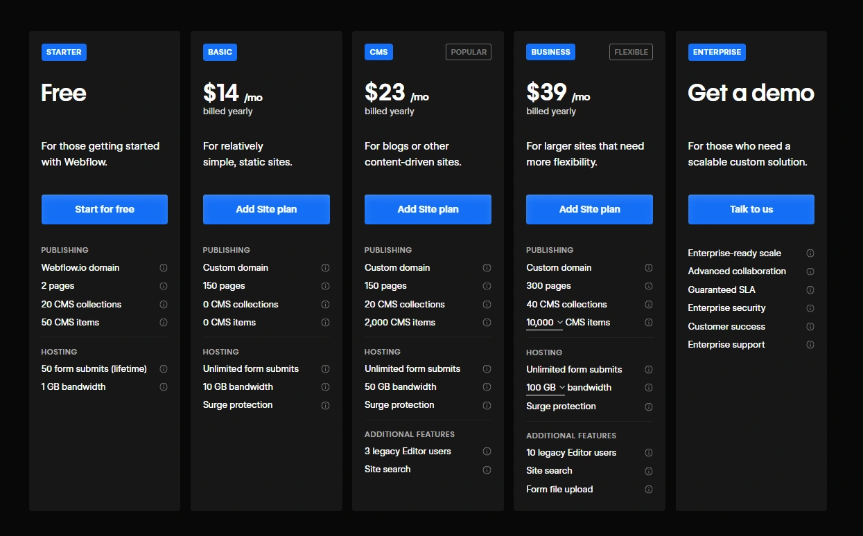 For larger businesses with custom requirements, Webflow also offers an Enterprise plan with custom pricing.