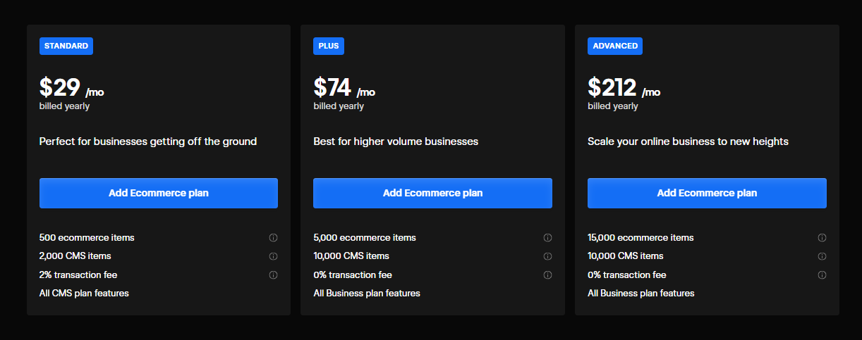 Plus Plan: The Plus plan is $74/month, increases the product limit to 1,000, and removes Webflow’s transaction fee.