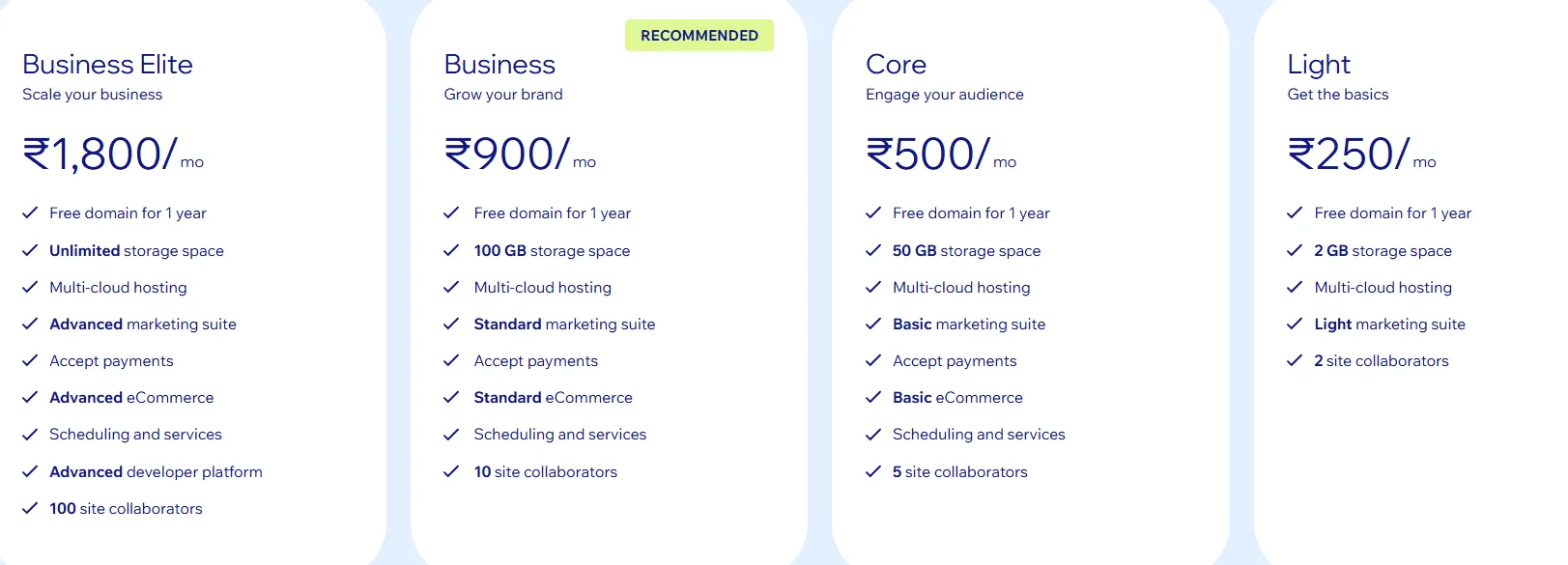 Core₹500/mo50 GB✅ BasicBasic5Small businesses & creators
